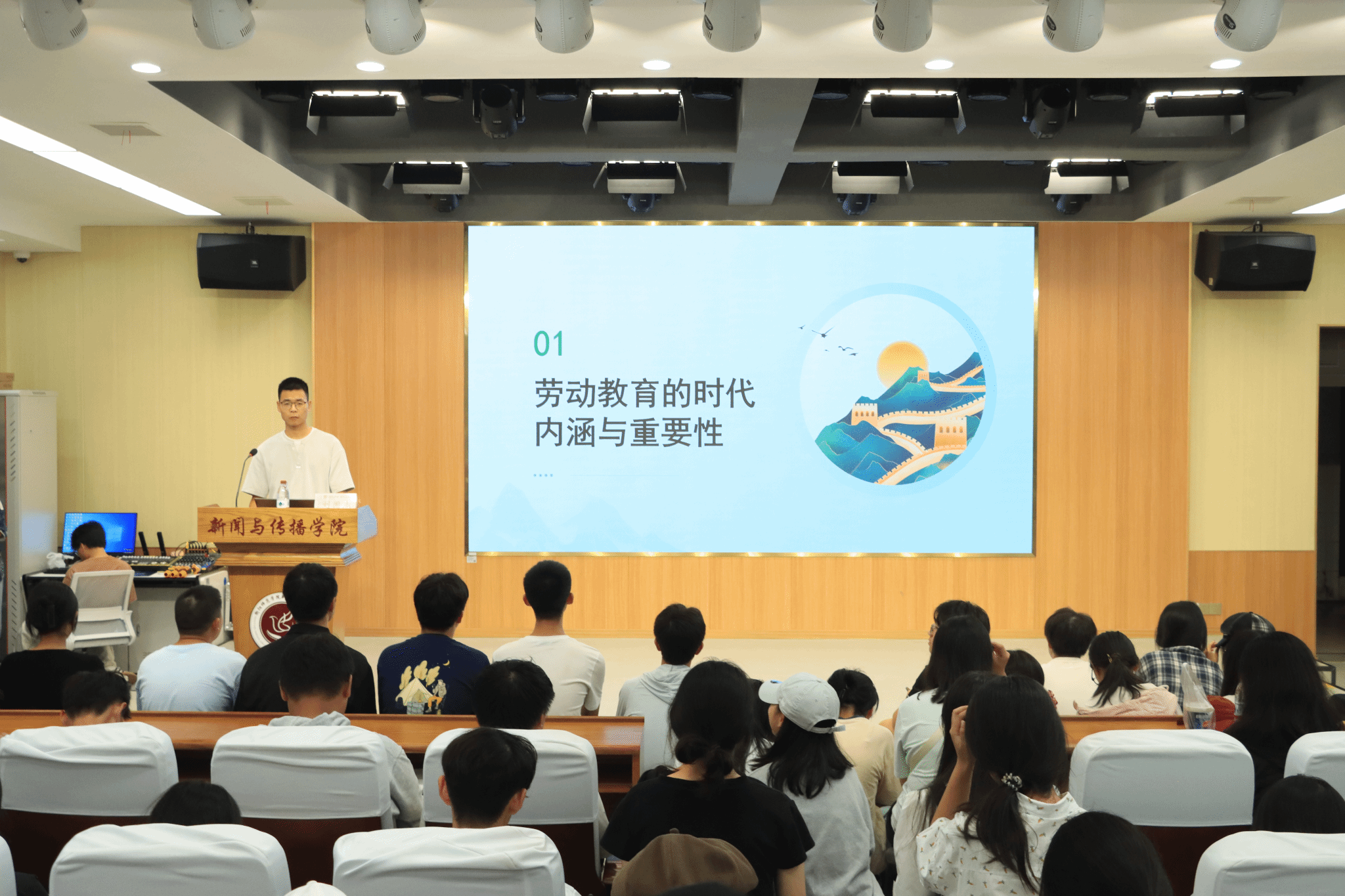 10月15日晚,新闻与传播学院在仁智楼A栋107演播厅开展2025级新生劳动教育讲座。辅导员刘国杰从劳动的时代内涵与重要性、新时代劳动教育三大特征以及校园内的劳动实践机会这三个方面展开劳动教育讲解。2025级全体新生到场聆听。