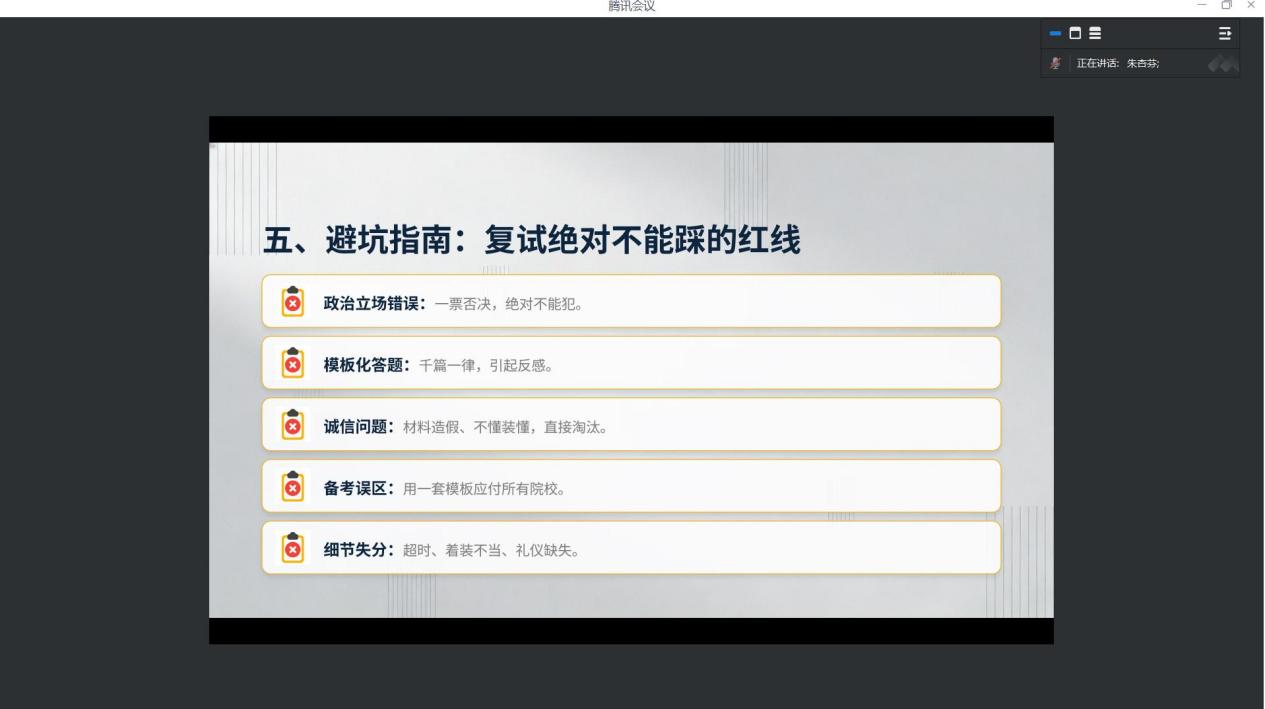 余永红学姐则瞄准考生最焦虑的面试环节,聚焦自我介绍、英语面试、综合专业面试、考前心态调整四大核心模块,做了系统且细致的策略讲解。从自我介绍的时长把控、内容取舍,到英语面试的高频话题、答题逻辑,再到综合面试的专业问答思路、临场应变技巧,她都一一拆解;针对考场可能出现的突发状况,比如突然卡壳、问题答不上来等情况,分享了实用的处置方法,还结合自身备考经历,给出了缓解考前焦虑、平稳心态的小妙招,帮大家放下心理包袱,从容应考。