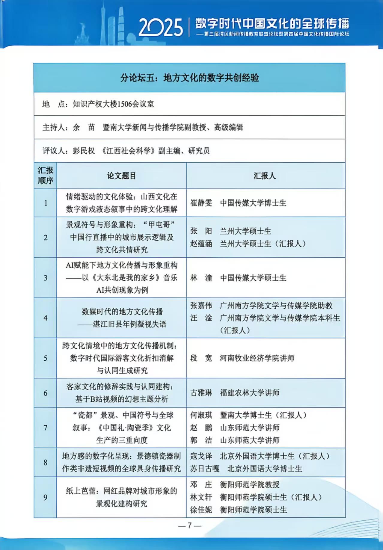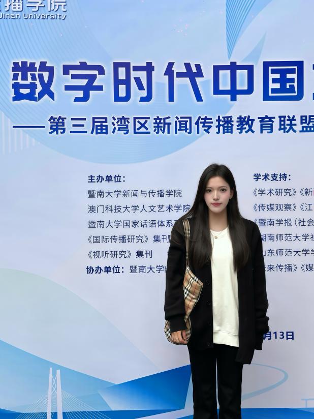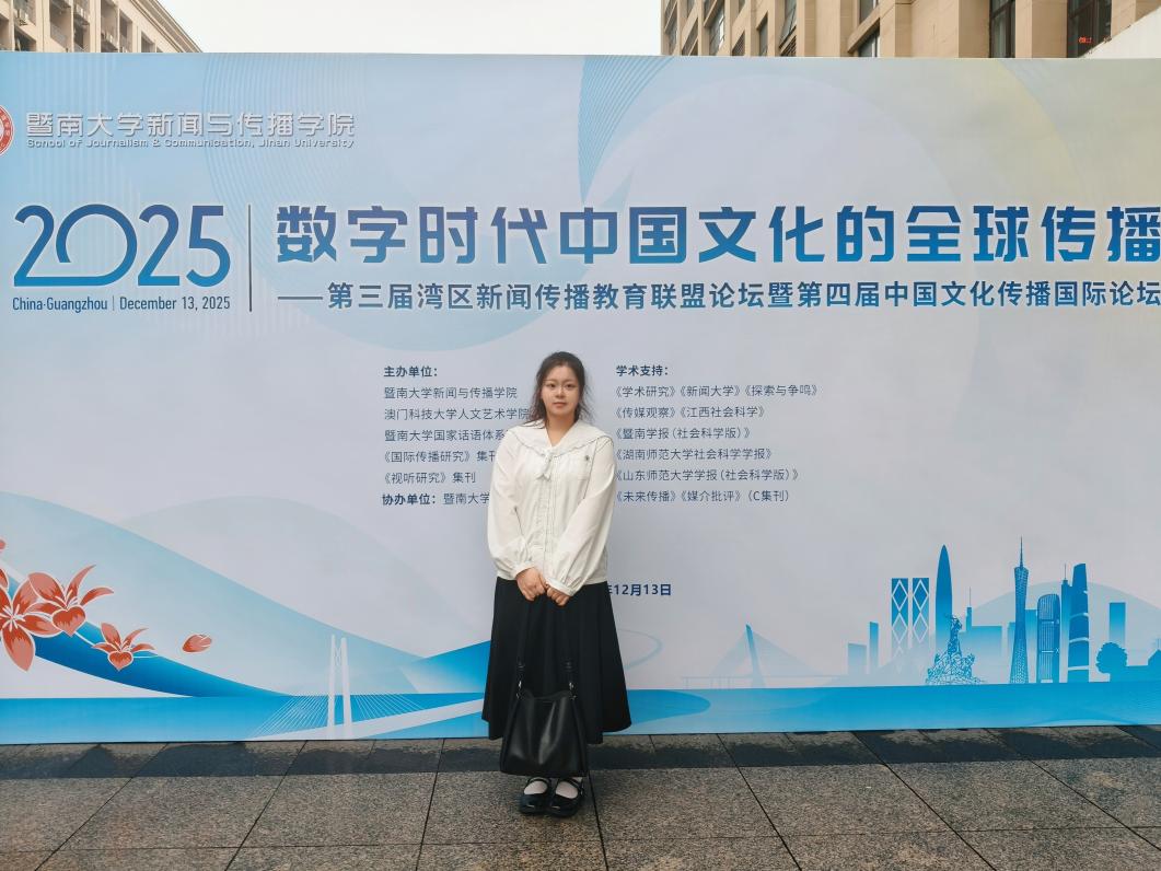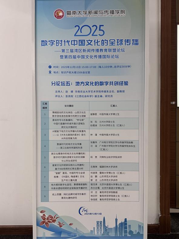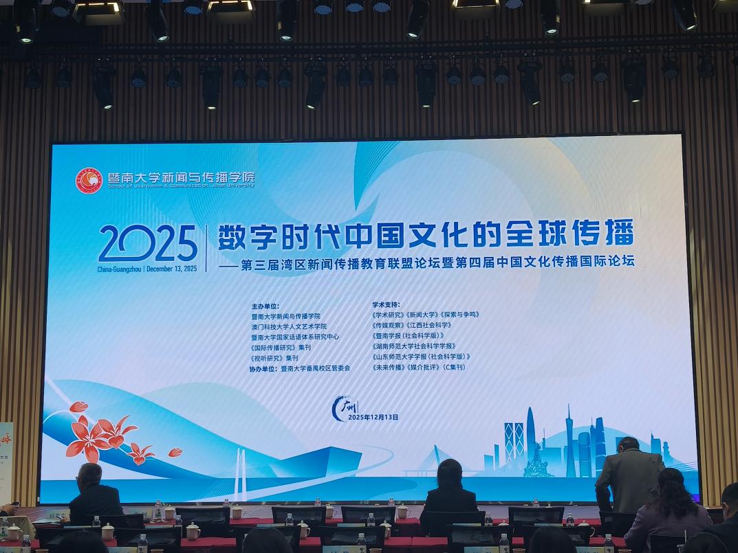 2025年12月13日,由暨南大学新闻与传播学院、暨南大学国家话语体系研究中心、《视听传播》集刊、《国际传播研究》集刊主办的“第三届湾区新闻传播教育联盟论坛暨第四届中国文化传播国际论坛”在广州成功举行。本届论坛主题为“数字时代中国文化的全球传播”,来自全国多所高校及研究机构的专家学者、青年学子与会。我院邓庄教授及其指导的硕士研究生林文轩、徐佳妮受邀参加此次论坛,并在会上进行学术成果展示与交流。